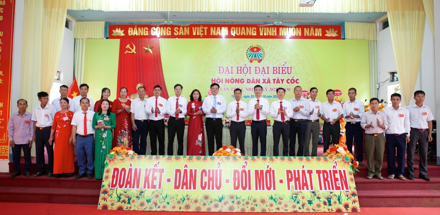 Ban chấp hành Hội Nông dân xã Tây Cốc nhiệm kỳ 2025-2030 ra mắt và chụp ảnh cùng các đồng chí lãnh đạo Hội Nông dân tỉnh Phú Thọ, lãnh đạo Đảng ủy, HĐND, UBND xã Tây Cốc