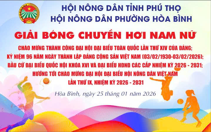 Ngày 25/01/2026, Hội Nông dân phường Hòa Bình tổ chức Giải bóng chuyền hơi nam nữ chào mừng thành công Đại hội đại biểu toàn quốc lần thứ XIV của Đảng; Kỷ niệm 96 năm Ngày thành lập Đảng Cộng sản Việt Nam (03/02/1930 – 03/02/2026); Bầu cử đại biểu Quốc hội khóa XVI và đại biểu HĐND các cấp nhiệm kỳ 2026 – 2031; hướng tới chào mừng Đại hội đại biểu Hội Nông dân Việt Nam lần thứ IX, nhiệm kỳ 2026 – 2031.
