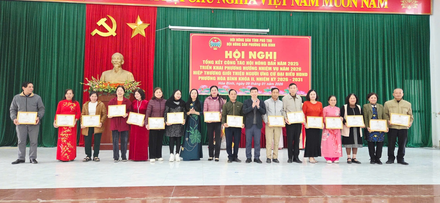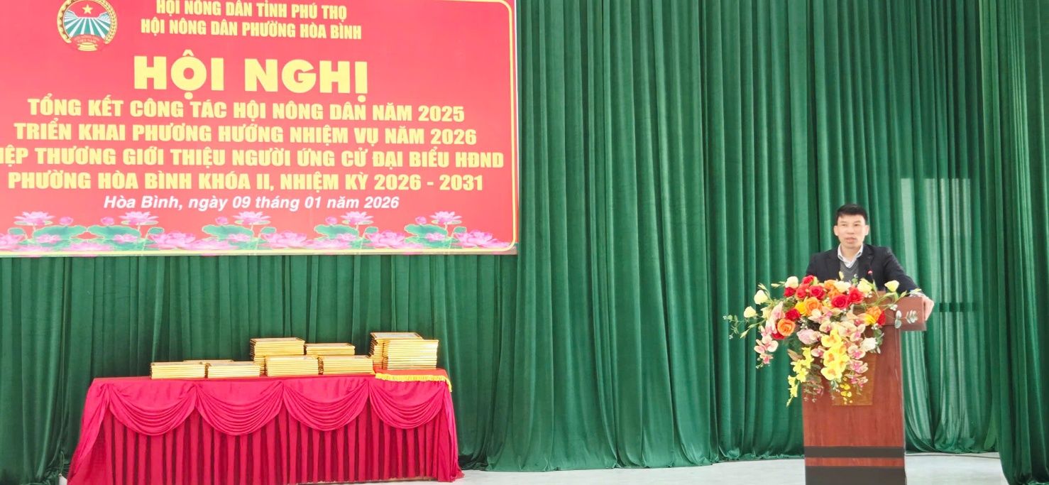 Chiều 09/01/2026, Hội Nông dân phường Hòa Bình tổ chức Tổng kết công tác Hội và phong trào nông dân năm 2025, triển khai nhiệm vụ năm 2026. Tham dự hội nghị có đồng chí Nguyễn Hữu Hiếu - Phó bí thư Thường trực Đảng ủy; đồng chí Đinh Thị Thu Hiền - Ủy viên BTV – Chủ tịch UBMTTQ Việt Nam phường; đồng chí Hoàng Châu Khôi - Ủy viên BCH Đảng bộ - Phó Chủ tịch UBND Phường. Cùng dự còn có các đồng chí lãnh đạo các tổ chức chính trị - xã hội; đại diện các chi hội nông dân, các tổ tiết kiệm và vay vốn; các tập thể, cá nhân được khen thưởng.
