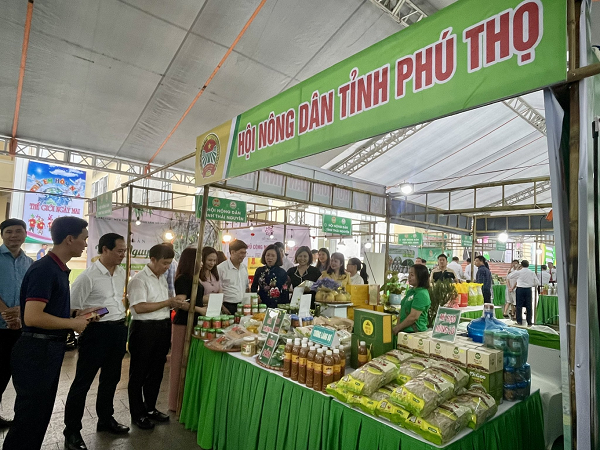 Hội Nông dân tỉnh Phú Thọ tham gia 01 gian hàng giới thiệu sản phẩm OCOP, nông sản tiêu biểu của tỉnh với gần 30 sản phẩm của các doanh nghiệp, hợp tác xã (HTX) tiêu biểu đem đến các mặt hàng đặc sắc như: mì gạo Hùng Lô, chè Hoài Trung, chè Đá Hen, thịt chua Thanh Sơn, gạo nếp gà gáy Mỹ Lung, bưởi Đoan Hùng, rau sắn muối chua Cẩm Khê, gà ủ muối Tân Sơn, thịt thính, cá thính, tương làng Bợ... Các sản phẩm tham gia giới thiệu đều đạt tiêu chuẩn OCOP từ 3 sao trở lên và sản phẩm đạt tiêu chuẩn VietGAP.