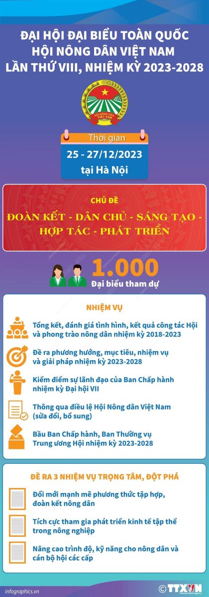 8. Đại hội đại biểu toàn quốc lần thứ VIII Hội Nông dân Việt Nam (2023-2028) được tổ chức từ ngày 25 - 27/12/2023 tại Hà Nội. Dự Đại hội có 1.000 đại biểu đại diện cho trên 10 triệu cán bộ, hội viên nông dân. Đại hội đã bầu 111 ủy viên Ban Chấp hành.