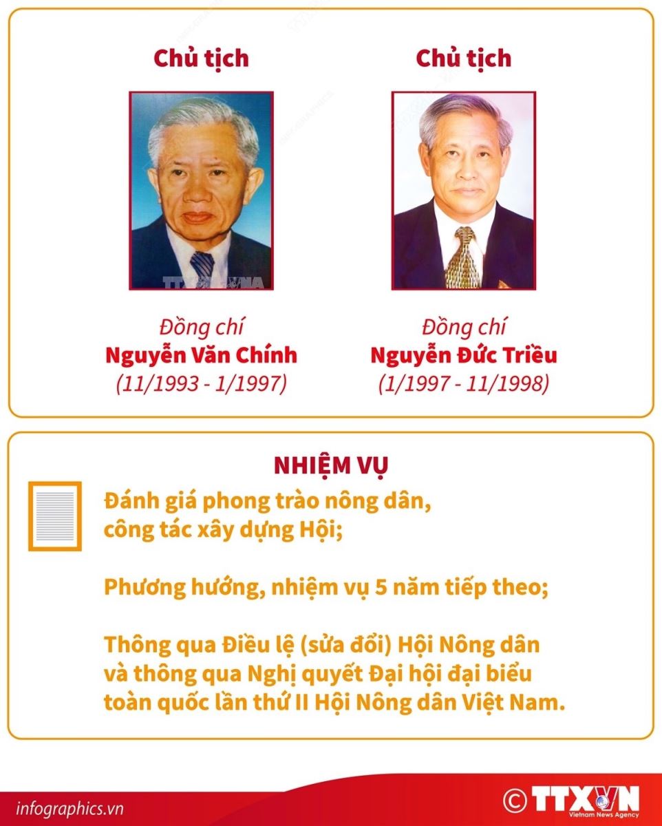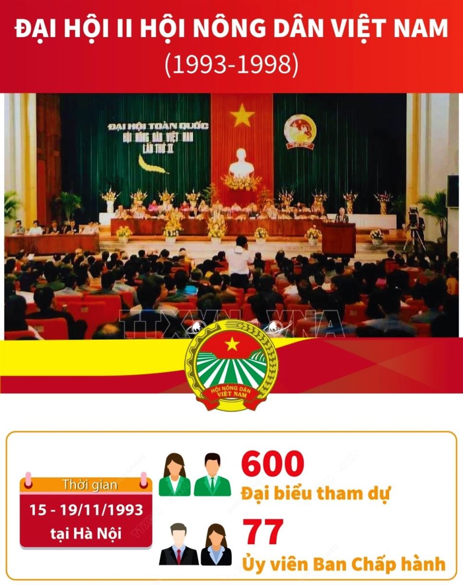 2. Đại hội đại biểu toàn quốc lần thứ II Hội Nông dân Việt Nam (1993-1998) diễn ra từ ngày 15 - 19/11/1993 tại Thủ đô Hà Nội. Dự Đại hội có 600 đại biểu đại diện cho hơn 7,2 triệu cán bộ, hội viên nông dân. Đại hội bầu 77 đồng chí vào Ban Chấp hành.