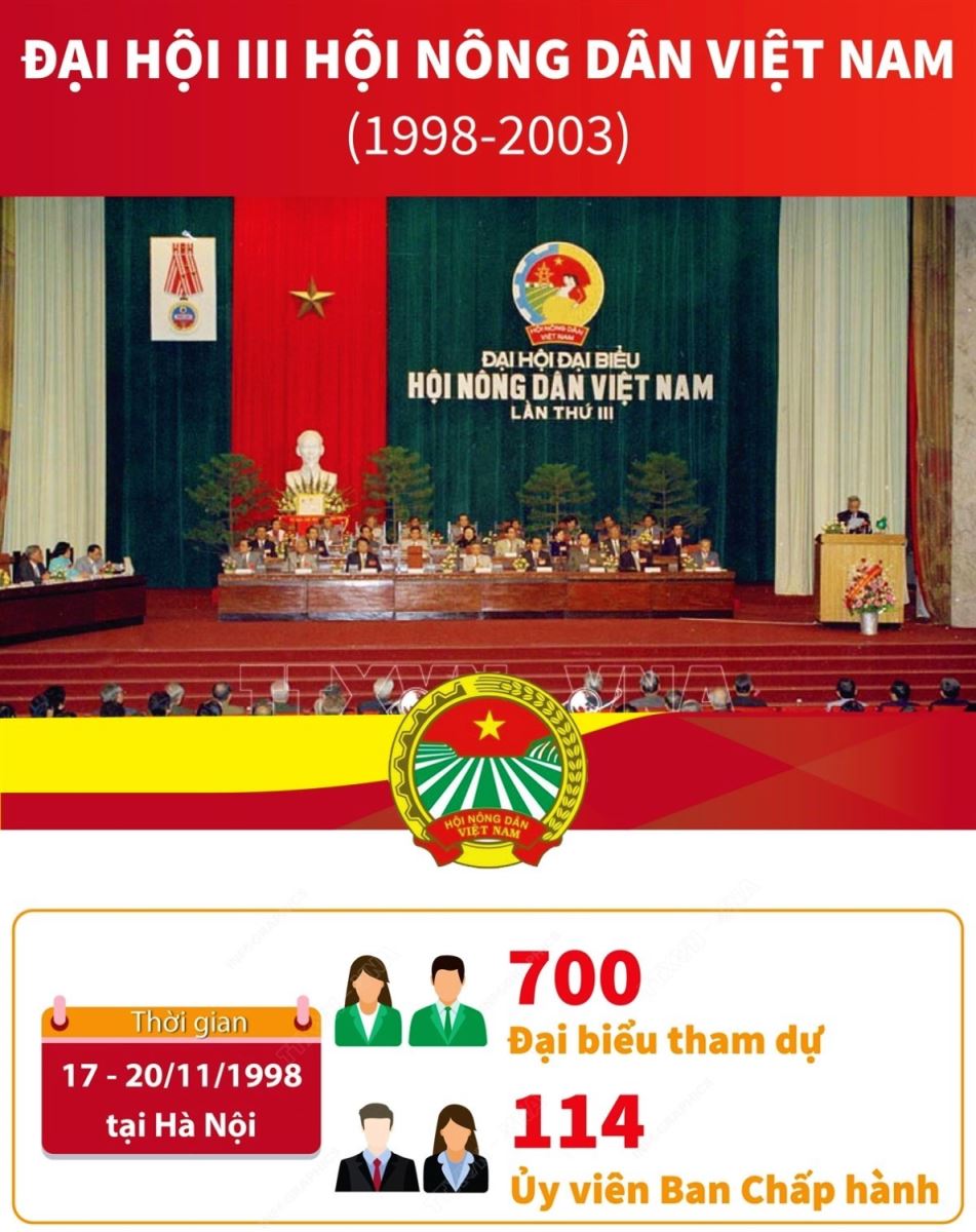 3. Đại hội đại biểu toàn quốc lần thứ III Hội Nông dân Việt Nam (1998-2003) diễn ra từ ngày 17 - 20/11/1998 tại Hà Nội. Tham dự Đại hội có 700 đại biểu. Đại hội đã bầu 114 đồng chí vào Ban Chấp hành. Đại hội đề ra những nhiệm vụ và giải pháp thực hiện chủ trương của Đảng về đẩy nhanh công nghiệp hóa, hiện đại hóa nông nghiệp, nông thôn; đổi mới và phát huy mạnh mẽ vai trò nòng cốt của Hội; tổ chức, động viên giai cấp nông dân phát huy nội lực xây dựng và phát triển đất nước...