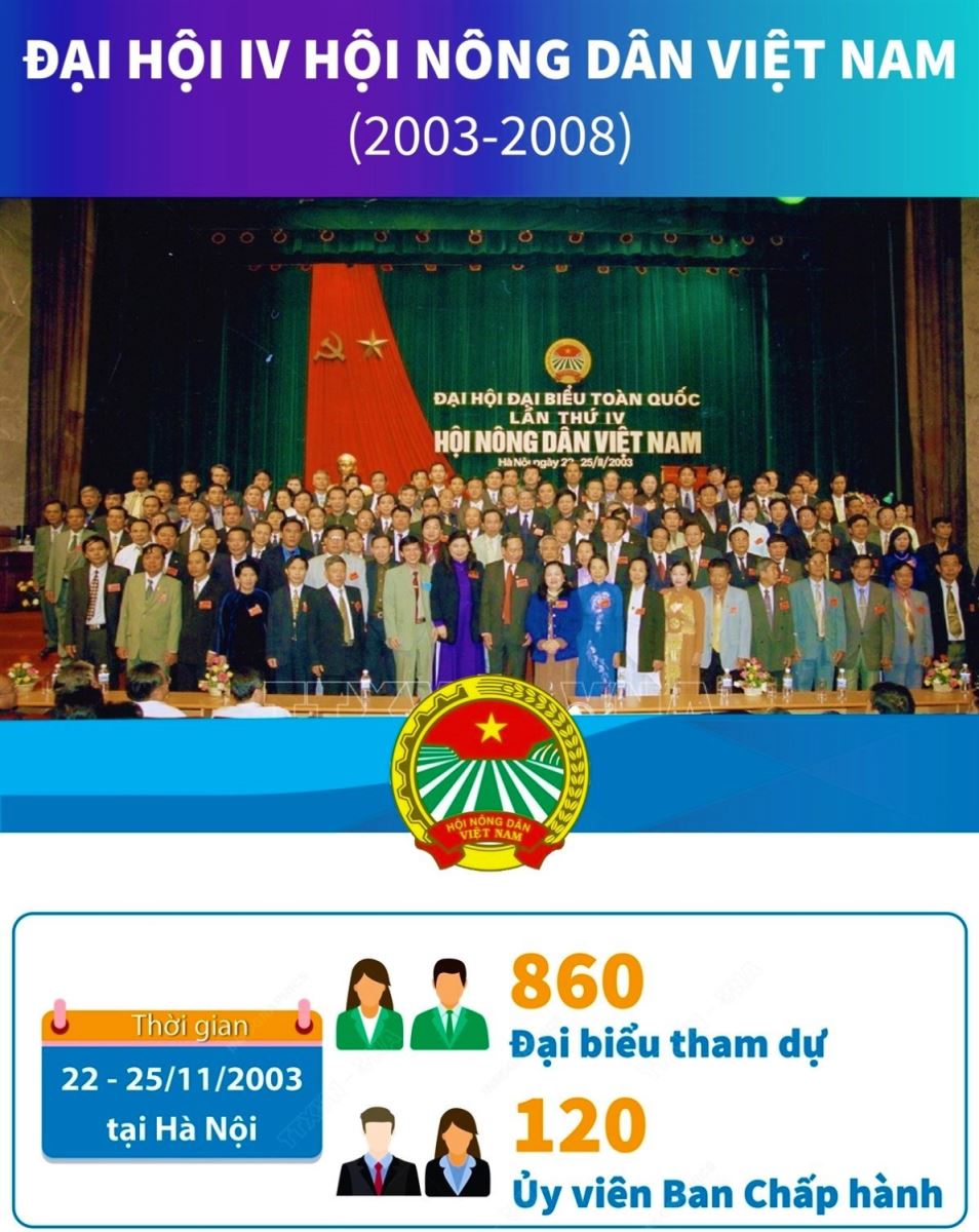 4. Đại hội đại biểu toàn quốc lần thứ IV Hội Nông dân Việt Nam (2003-2008) được tổ chức từ ngày 22 - 25/11/2003, tại Hà Nội. Dự Đại hội có 860 đại biểu đại diện cho hơn 8 triệu cán bộ, hội viên nông dân. Đại hội đã bầu 120 ủy viên Ban Chấp hành.