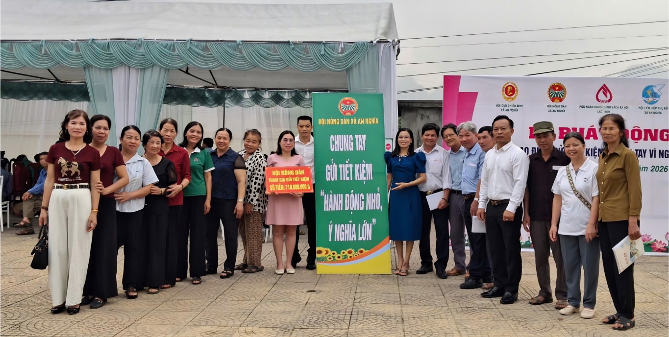 Ngày 14/04/2026, Hội Nông dân xã An Nghĩa đã phối hợp với Ngân hàng CSXH Lạc Thuỷ và các tổ chức chính trị - xã hội tổ chức thành công Lễ phát động "Tháng cao điểm gửi tiết kiệm chung tay vì người nghèo”.
