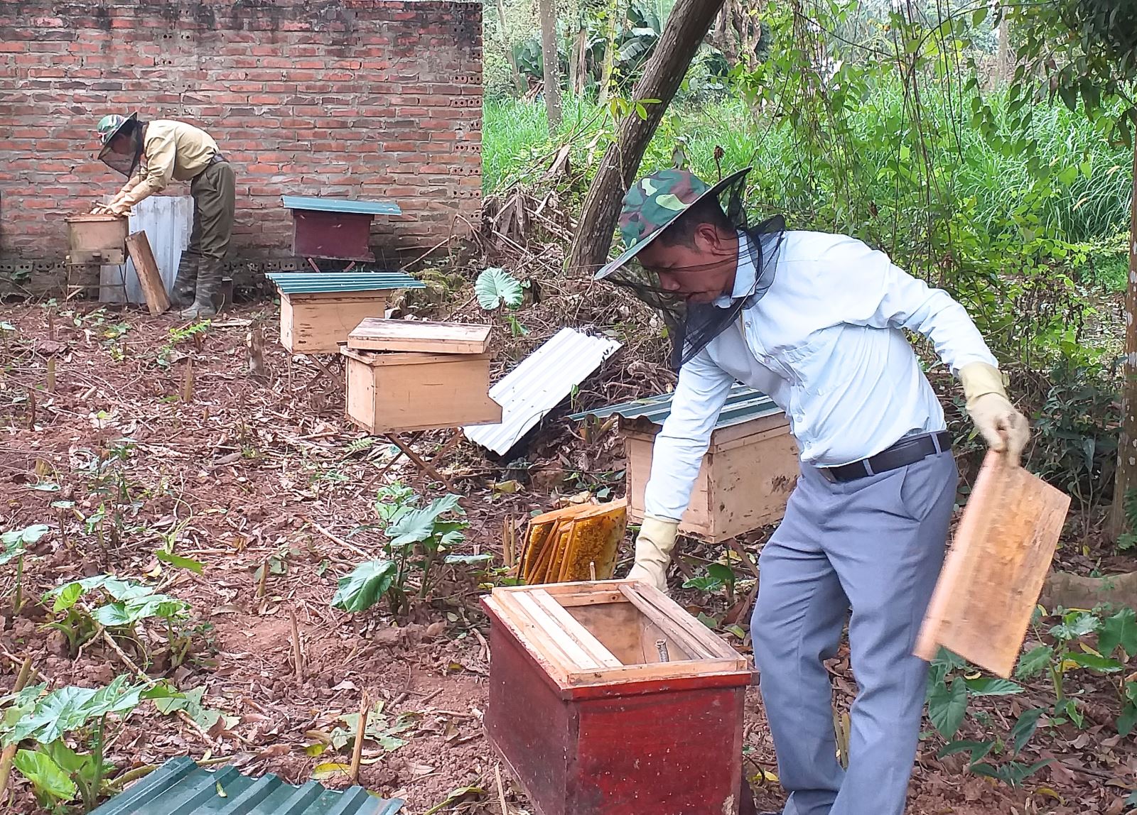 Hội viên nông dân Vũ Hồng Sơn ở khu Suối 1 xã Phú Khê khai thác mật ong