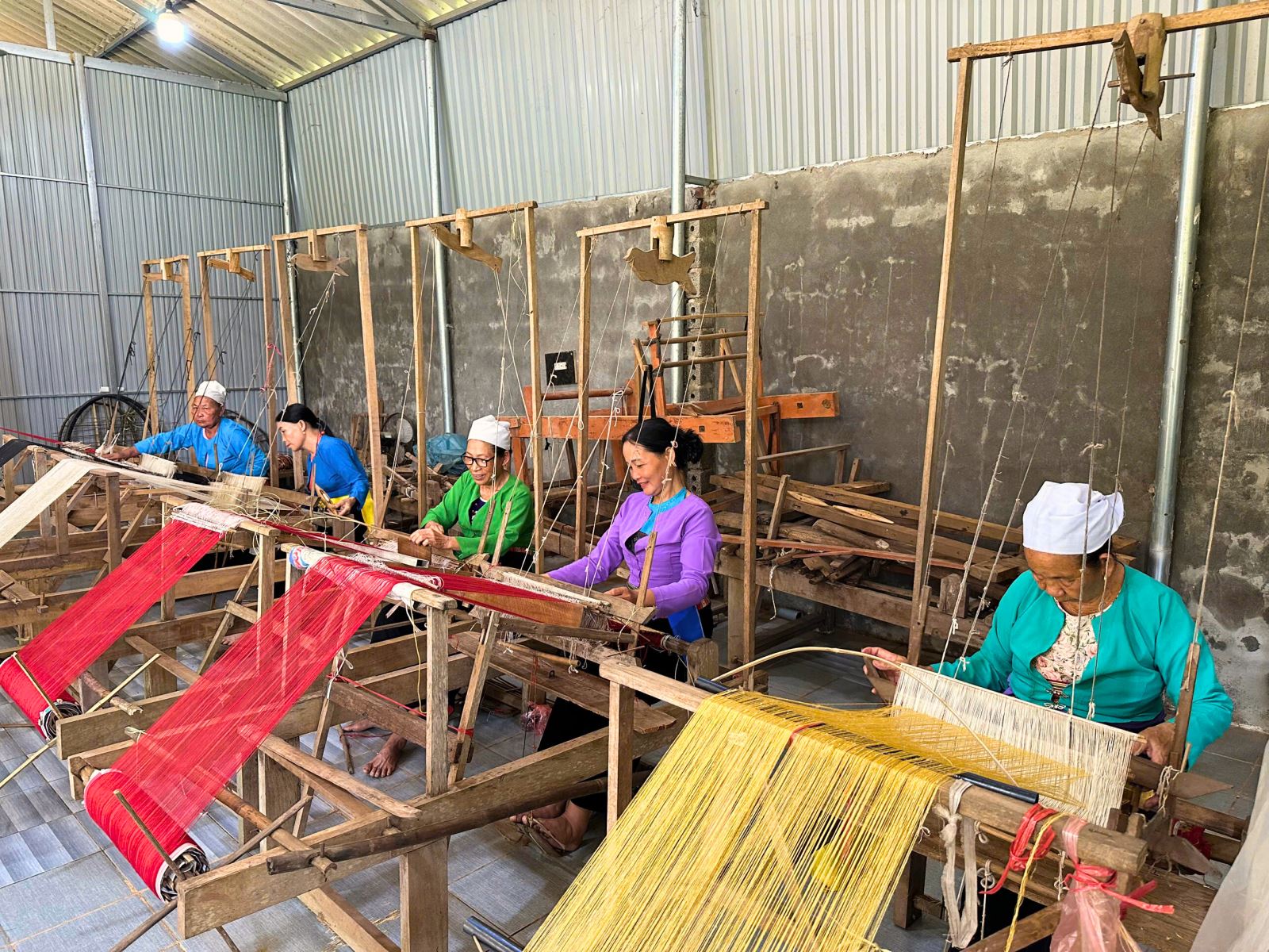 Các thành viên HTX kiểm tra sản phẩm vừa được dệt