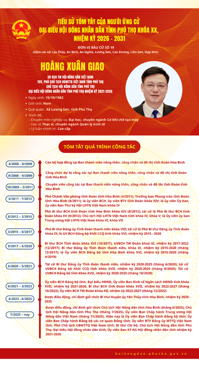 Đồng chí Hoàng Xuân Giao - Ủy viên BCH Trung ương Hội Nông dân Việt Nam, TUV, Phó Chủ tịch Ủy ban Mặt trận Tổ quốc Việt Nam tỉnh, Chủ tịch Hội Nông dân tỉnh ứng cử Đại biểu Hội đồng nhân dân tỉnh Phú Thọ khóa XX tại đơn vị bầu cử số 19 tỉnh Phú Thọ. Theo chương trình công tác, từ ngày 09 đến 10/3/2026, đồng chí Hoàng Xuân Giao sẽ tiến hành tiếp xúc cử tri để thông qua chương trình hành động tại các địa bàn tham gia ứng cử.