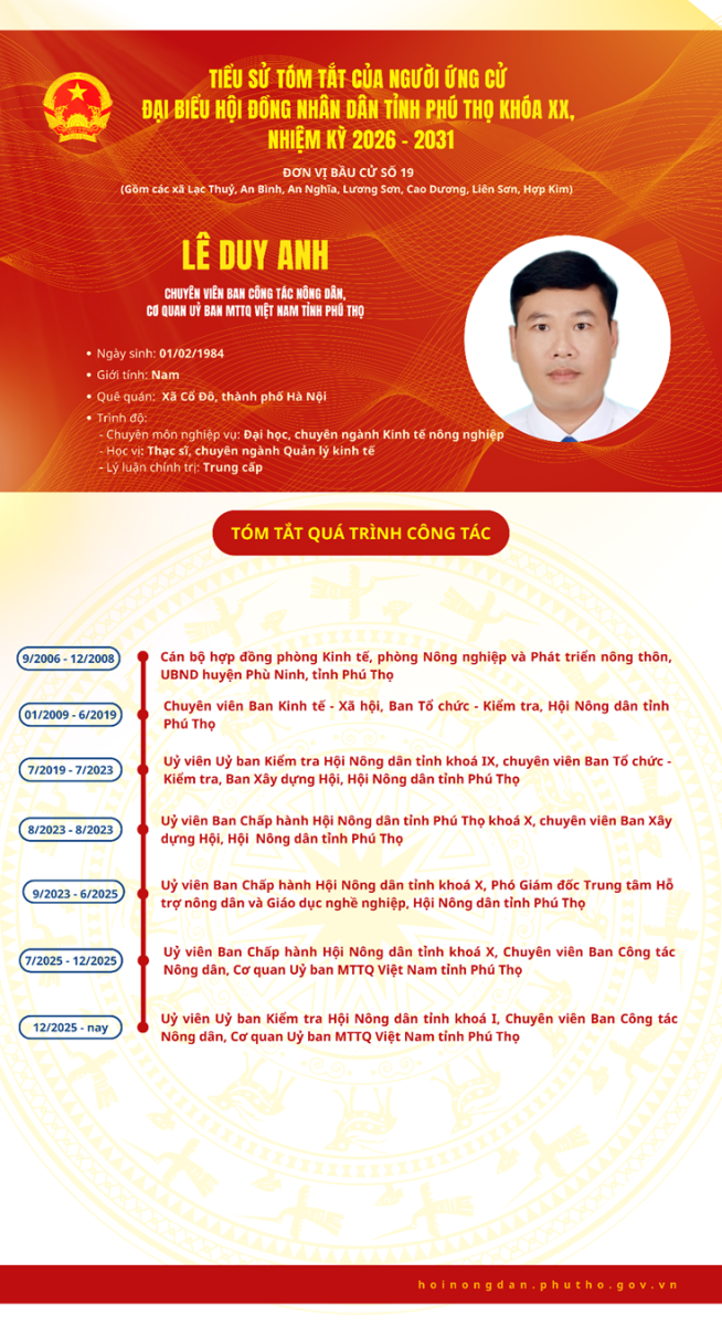 Hội Nông dân tỉnh Phú Thọ trân trọng giới thiệu Infographic tiểu sử tóm tắt của đồng chí Lê Duy Anh ứng cử Đại biểu Hội đồng nhân dân tỉnh Phú Thọ