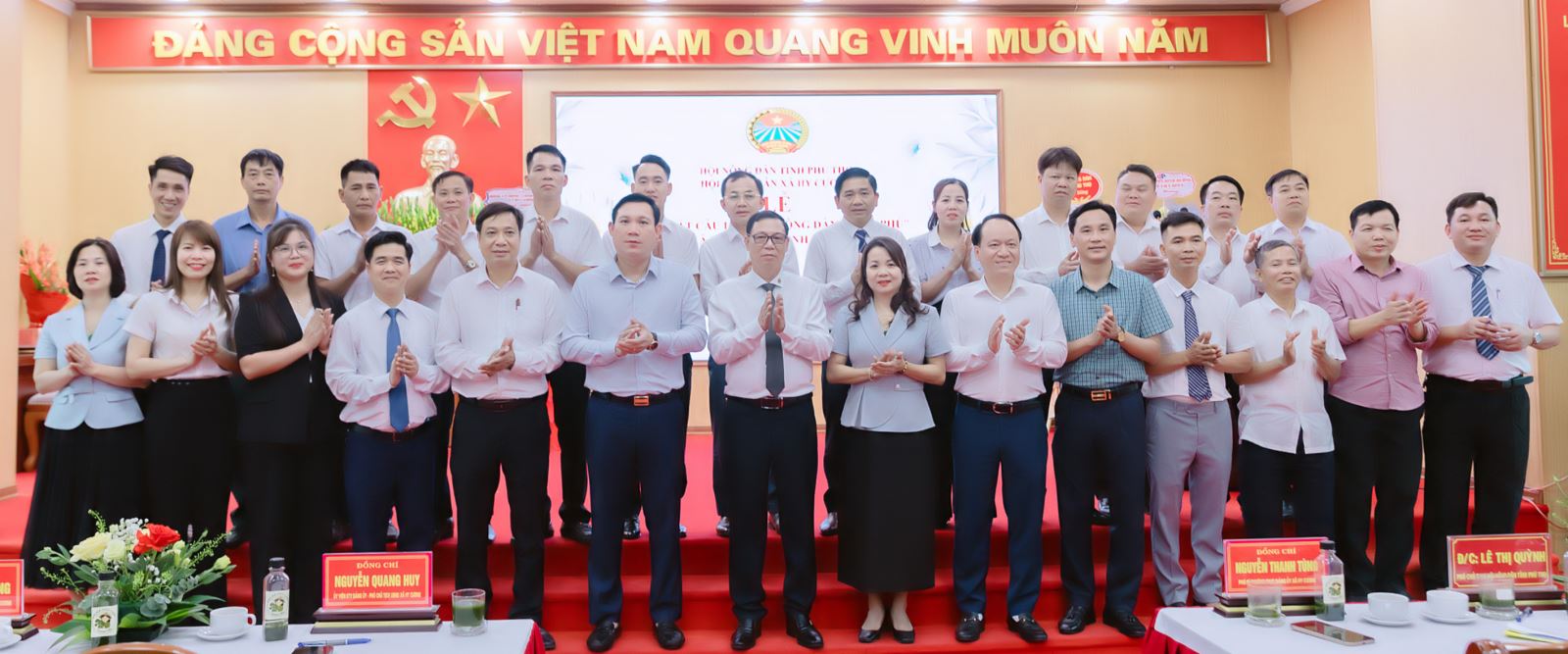 Các đồng chí Lãnh đạo Hội Nông dân tỉnh, Lãnh đạo Đảng ủy – HĐND – UBND – UBMTTQ xã Hy Cương chụp ảnh lưu niệm với các thành viên Câu lạc bộ “Nông dân triệu phú” xã Hy Cương